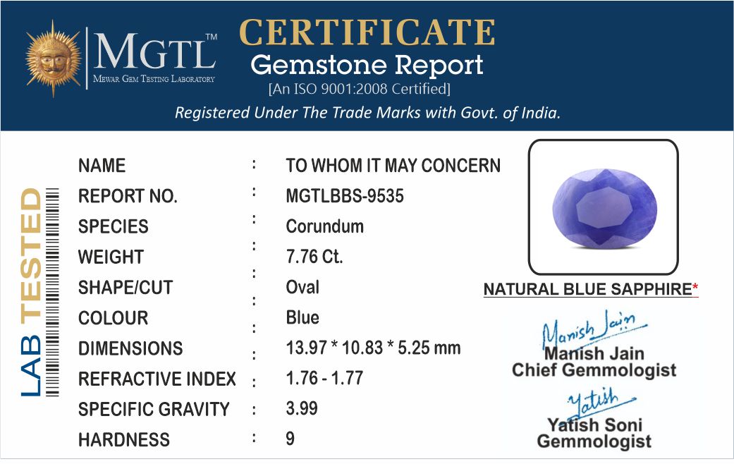 | Weight | 7.76 carat / 8.46 Ratti / 1.55 grams |
