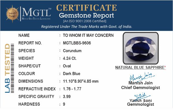 | Weight | 4.24 carat / 4.62 Ratti / 0.85 grams |