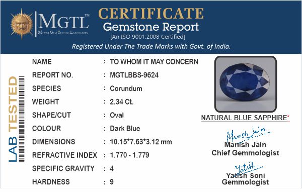 Weight | 2.34 carat / 2.55 Ratti / 0.47 grams |