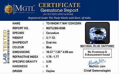| Weight | 4.11 carat / 4.48 Ratti / 0.82 grams |
