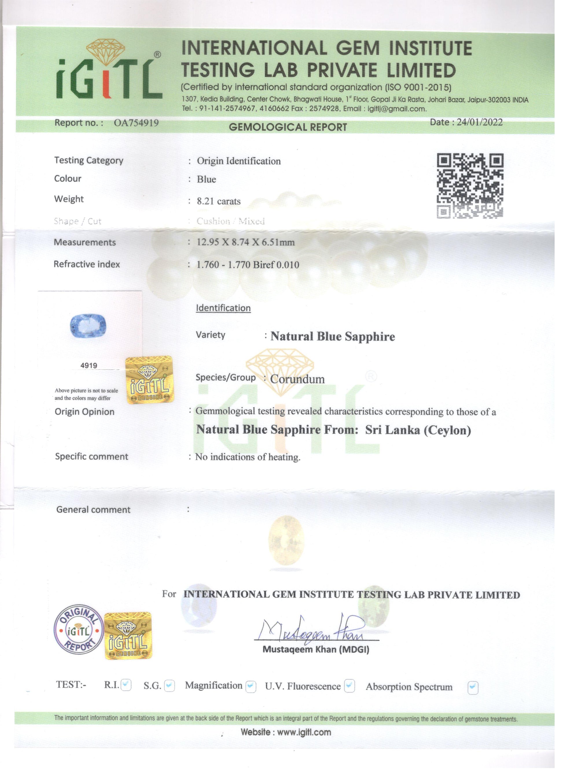 Weight | 8.21 carat / 8.95 Ratti / 1.64 grams |