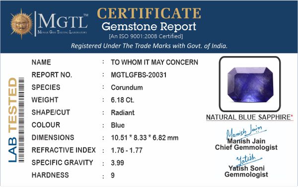 | Weight | 6.18 carat / 6.74 Ratti / 1.24 grams |
