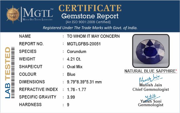 | Weight | 4.21 carat / 4.59 Ratti / 0.84 grams |