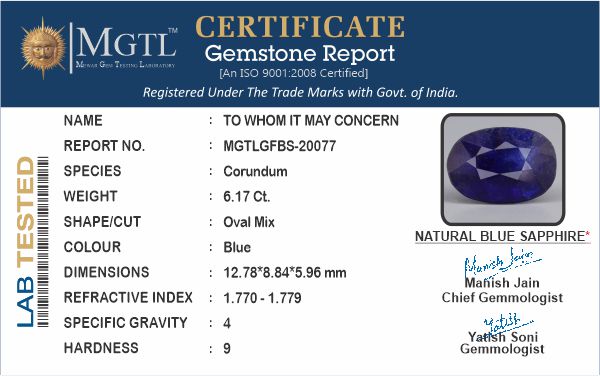 | Weight | 6.17 carat / 6.73 Ratti / 1.23 grams |