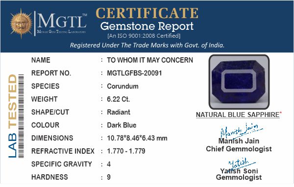 | Weight | 6.22 carat / 6.78 Ratti / 1.24 grams |