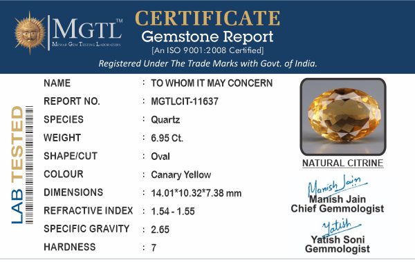 | Weight | 6.95 carat / 7.58 Ratti / 1.39 grams |