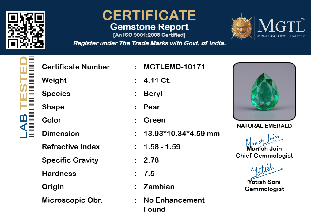 | Weight | 4.11 carat / 4.48 Ratti / 0.82 grams |