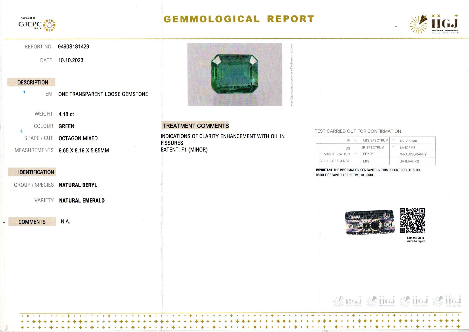 | Weight | 4.18 carat / 4.56 Ratti / 0.84 grams |
