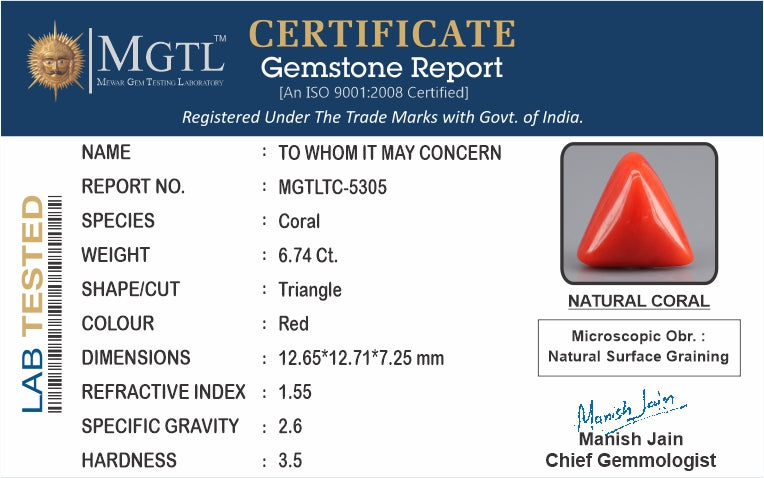 | Weight | 6.74 carat / 7.35 Ratti / 1.35 grams |