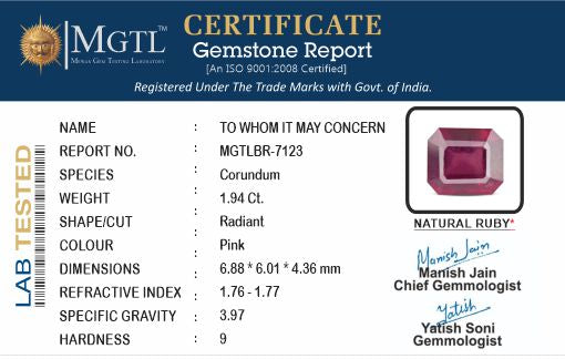 | Weight | 1.94 carat / 2.11 Ratti / 0.39 grams |