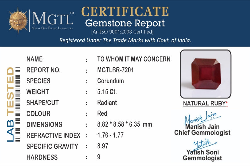 | Weight | 5.15 carat / 5.61 Ratti / 1.03 grams |