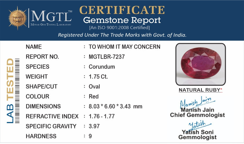 | Weight | 1.75 carat / 1.91 Ratti / 0.35 grams |