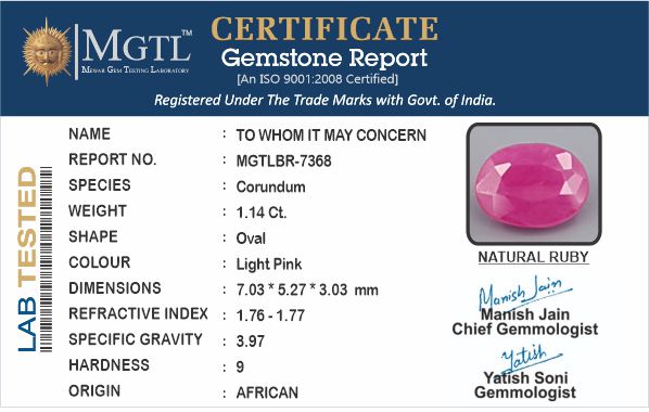 | Weight | 1.14 carat / 1.24 Ratti / 0.23 grams |