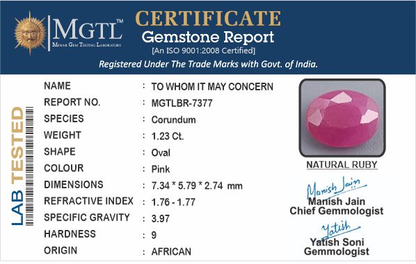 | Weight | 1.23 carat / 1.34 Ratti / 0.25 grams |