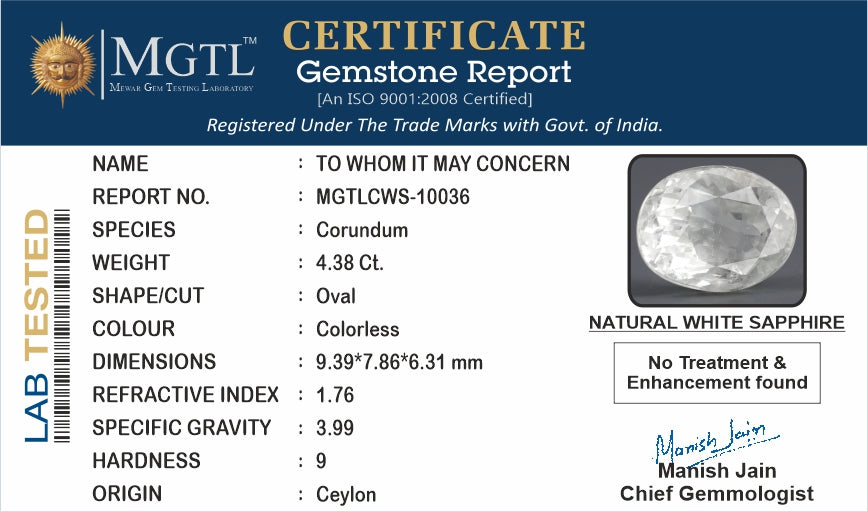 | Gemstone | White Sapphire - (Safed Pukhraj) |